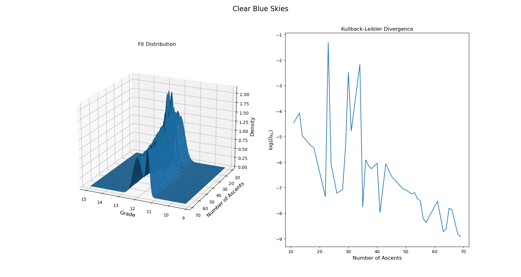 Let’s see the math in action! I applied this model to a case study by comparing two climbs on Mt. Blue Sky, Colorado: “Clear Blue Skies” and “No More Greener Grasses.” There is much debate about whether each climb is “V11” or “V12.” These two climbs were chosen because of their proximity which somewhat controls for the effects of environmental factors; on the other hand weather in the alpine is highly variable, so perhaps not. They sit only feet from each other on the same piece of rock. Also, both climbs see many repeats every year, providing the necessary quantity of data. Studying these problems isolates significant factors that impact climbers’ reported grades.
