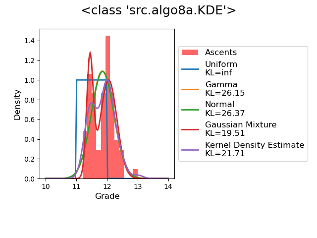 For all of the available debiased CBS grades, I fit the Uniform, Gamma and Normal distributions to the data, as well as a Gaussian Mixture, and KDE. We see that the Gaussian Mixture or KDE performs best.
