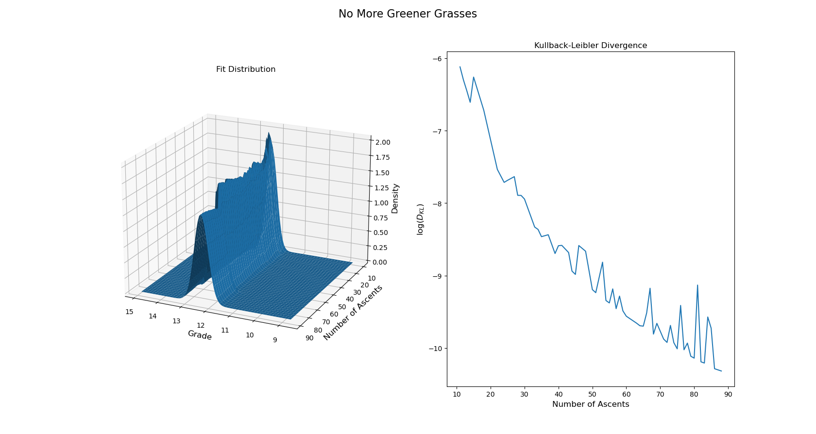Mathematically, this hypothesis can be tested to see what grades actually converge to. If in fact a climbing grade converges to a single number as the number of ascents increases, the fit distribution eventually becomes more and more sharply peaked around a specific number. This is called a Dirac function. If on the other hand the grade converges to a distribution then there is proof that a grade is not a single number, but instead a random variable.