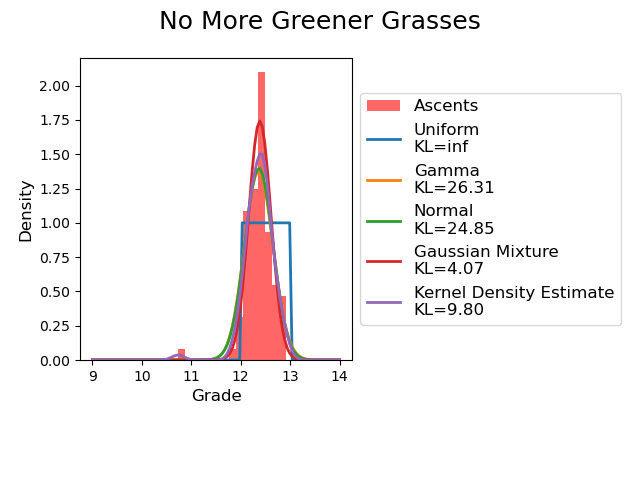 The KL divergence varies depending on which distribution is used. It may be tempting to blindly select the Gaussian Mixture for both climbs because it does minimize the KL divergences. However, qualitatively CBS appears to have two modes (peaks) while NMGG visually has one mode with a single outlier. Thus, the Gaussian Mixture and the KDE could be overfitting the data in the case of NMGG and likely selecting the Gamma or Normal distribution is more prudent.