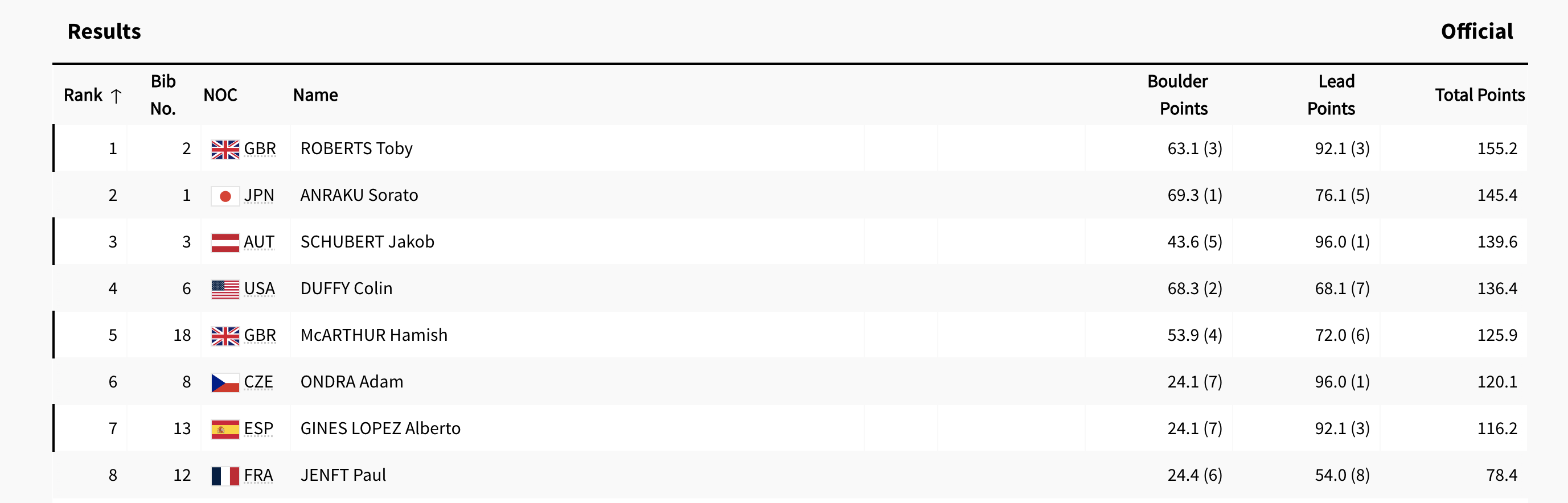 The menâs field was a nice contrast to the womenâs in that there has not been a sustained dominance from a single male climber in nearly a decade. That being said the old guard that is present is quite accomplished and still vying for their place on the podium with Adam Ondra, Jakob Schubert, Tomoa Narasaki and to a lesser extent Alex Megos. The young guns are on the rise with the likes of Toby Roberts, Sorato Anraku, Do-hyun Lee and Colin Duffy. This set the stage for a big show!