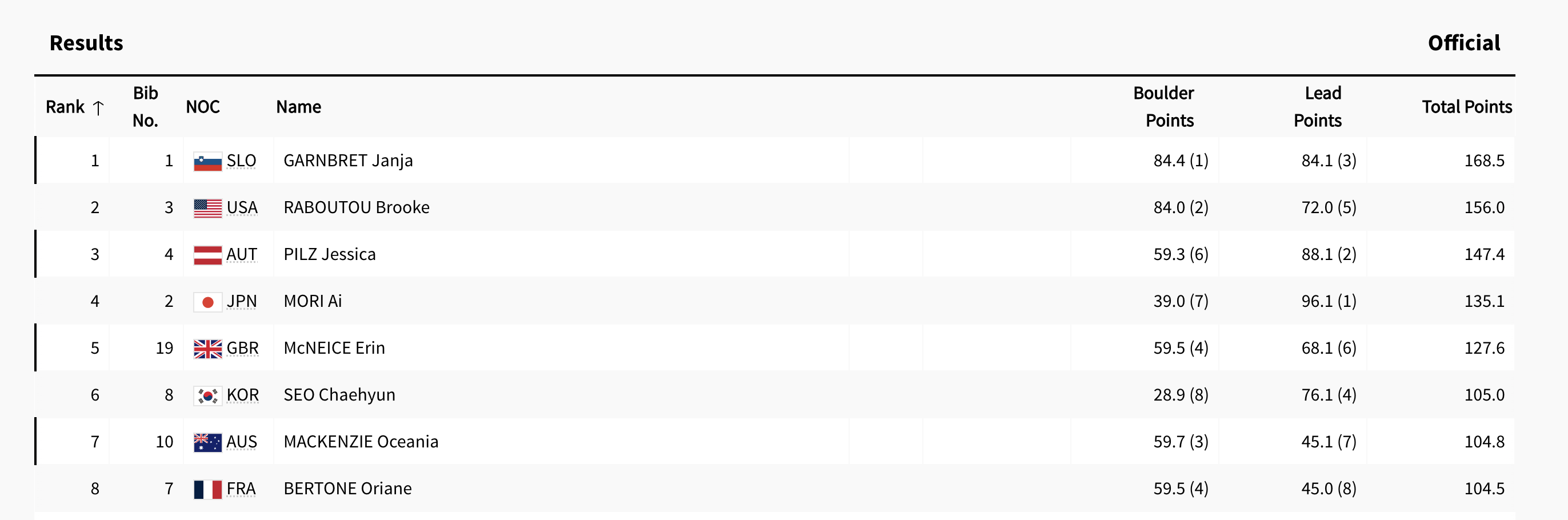 - +265, Ai Mori - This is a contentious choice putting her below Brooke⌠She is very good and has been (arguably) more dominant than Brooke on the World Cup Circuit. She has been performing well in the last couple years, but her only Bouldering World Cup medal being a bronze in Wujiang 2023 makes me give the edge to Brooke. Also, because of the nature of the Olympics as a showcase event, the setters may want to provide problems that are more gymnastic that will not suit Aiâs more controlled style.Â